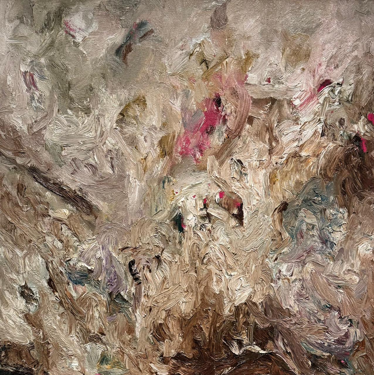 En esta obra al óleo, Teresa Núñez Valdivieso explora la materia pictórica a través de una composición abstracta donde las pinceladas densas y gestuales construyen un paisaje sugerido. Tonos terrosos, ocres y cremas se entrelazan con toques de color más intensos, evocando la textura orgánica de la vegetación y la tierra.