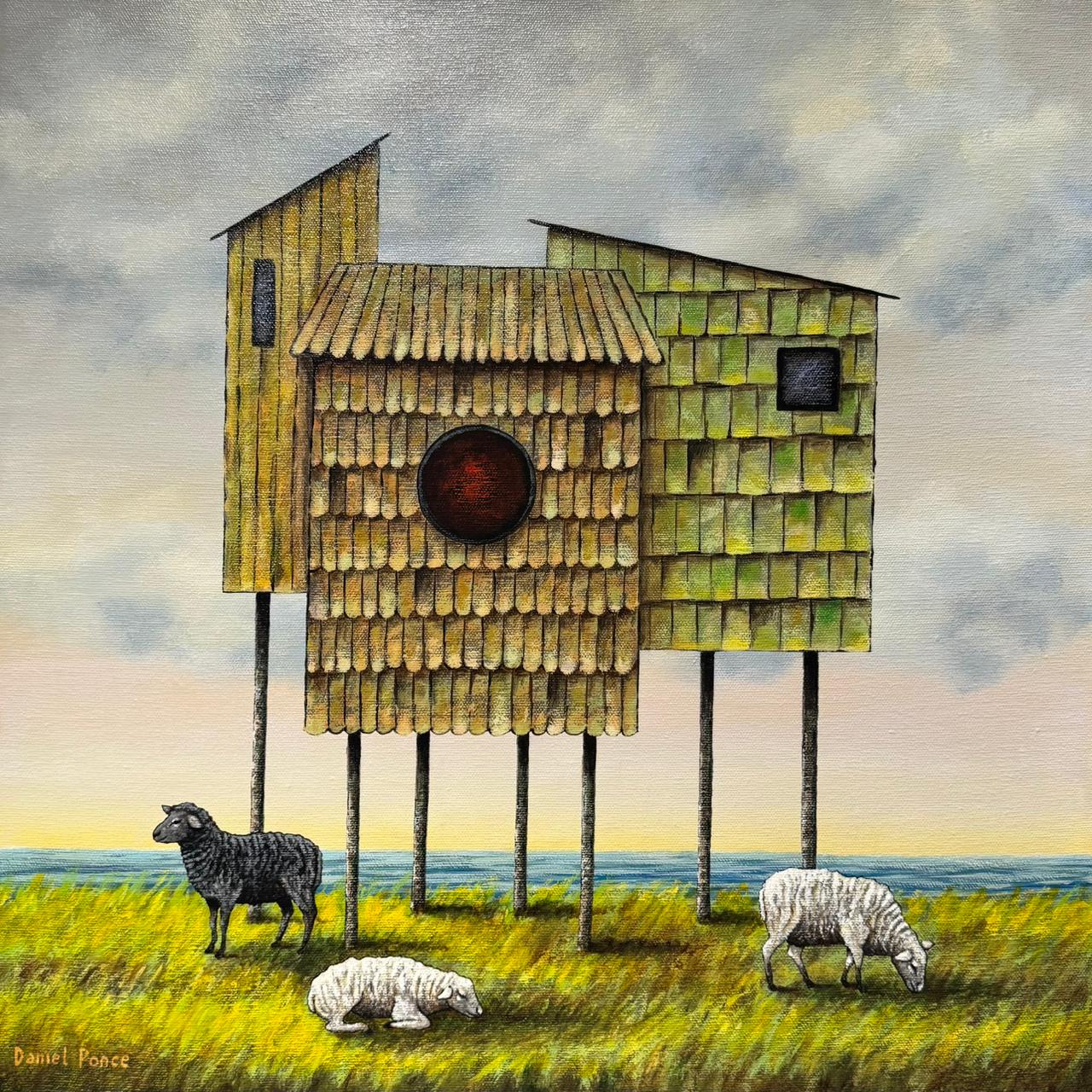 En esta obra realizada en acrílico, Daniel Ponce presenta una escena que evoca los paisajes del sur de Chile, donde la arquitectura rural dialoga con la naturaleza. Tres estructuras elevadas sobre pilotes, revestidas con tejuelas, se alzan frente al mar como pequeñas construcciones imaginadas que recuerdan los palafitos y las formas tradicionales del borde costero. Sus líneas simples y geométricas contrastan con la suavidad del cielo y del paisaje.