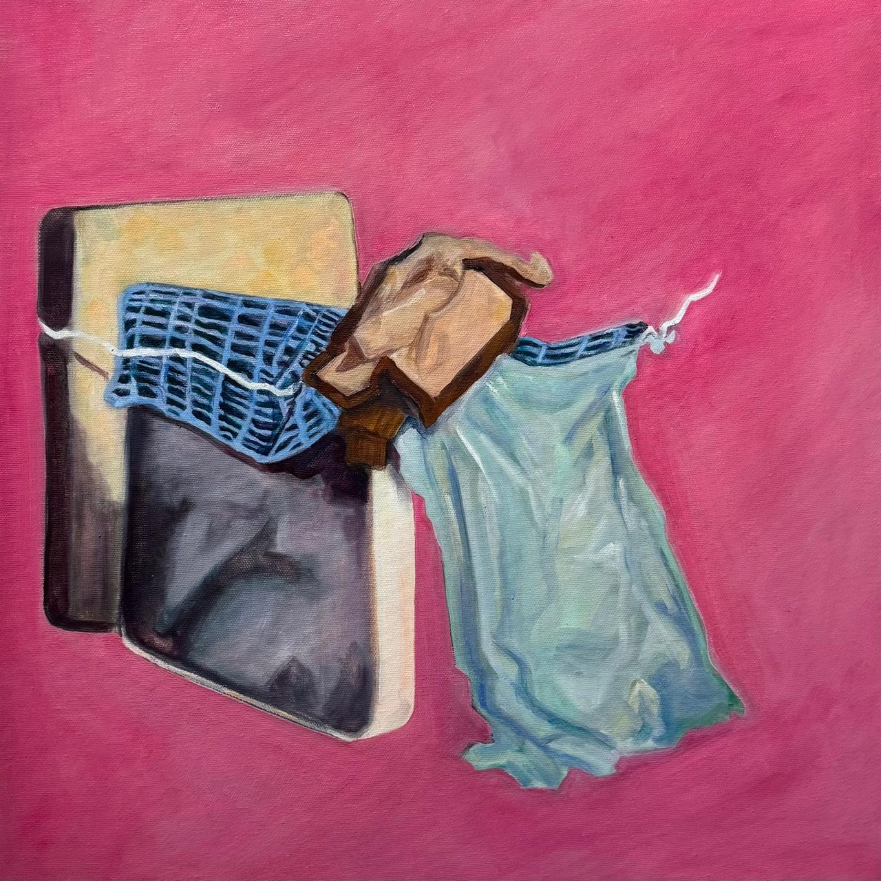 En Hay algo ahí que no sé lo que será, Víldosa presenta una escena cargada de misterio y tensión simbólica. Sobre un fondo rosado intenso, diversos objetos parecen suspendidos en un espacio incierto: una superficie que sugiere un rostro difuso, una red que los conecta y una mano que sostiene un objeto indefinido. La composición genera una sensación de inquietud y curiosidad, invitando al espectador a buscar significados ocultos.