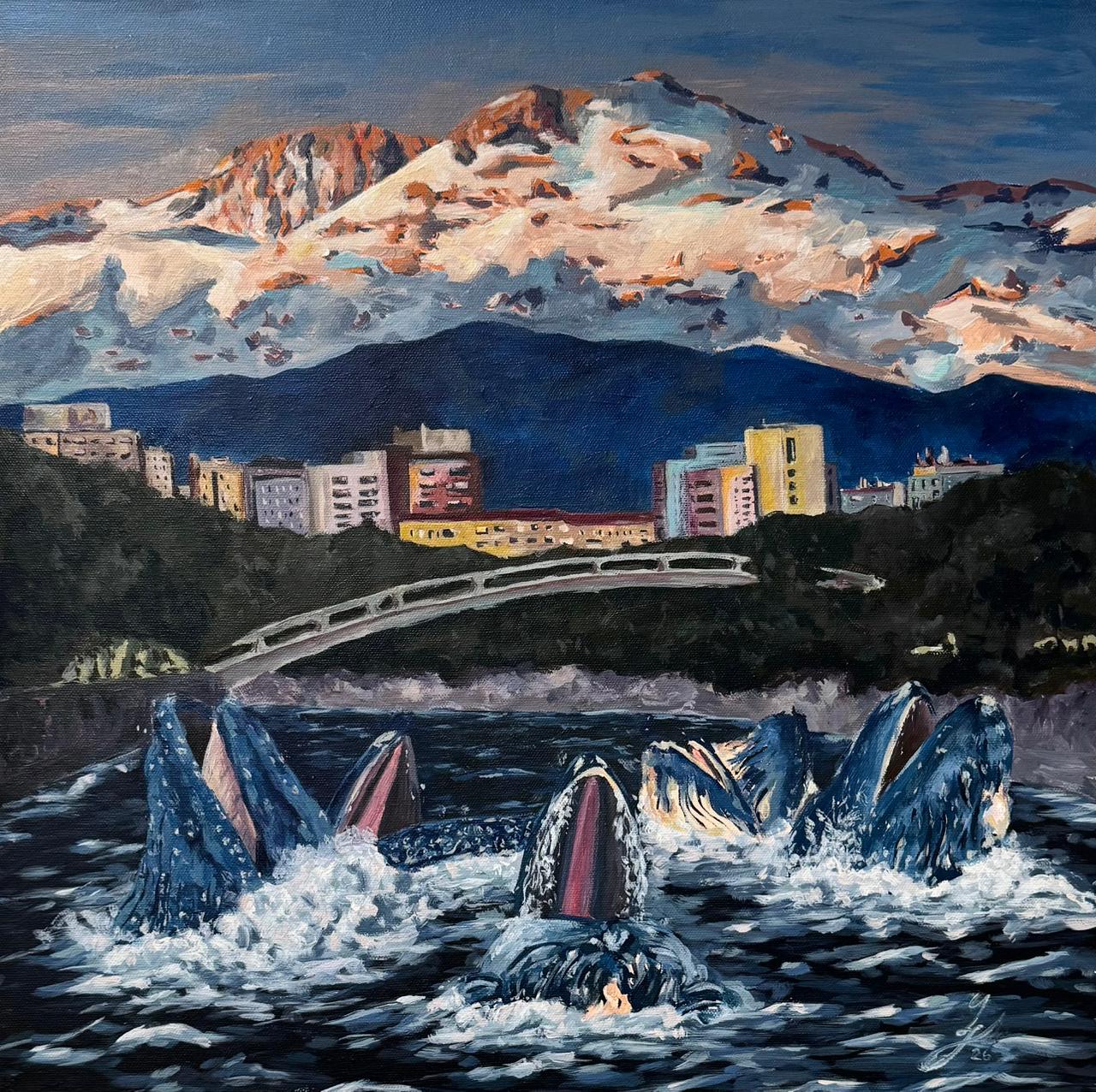 En esta pintura en acrílico, Gonzalo Pulido presenta una escena vibrante donde la ciudad convive con la fuerza de la naturaleza. En primer plano, un grupo de ballenas emerge del agua en un gesto dinámico que llena de movimiento el paisaje urbano.